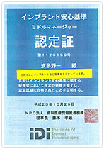 インプラントセーフティーマークとは左掲のマークで、安全・安心なインプラント治療を受けたいと考える国民に対し、正確で信頼出来る情報を提供するために、歯科医療機関の第三者評価機関であるNPO法人歯科医療情報推進機構(以下IDIといいます)がISM基準に定め られた「安全性」を、「環境」「技術」「運用」の観点から総合的に評価し、一定レベル以上にあると認定した歯科医療機関にだけ付与し、使用を許諾する安全・安心の信頼マークです。